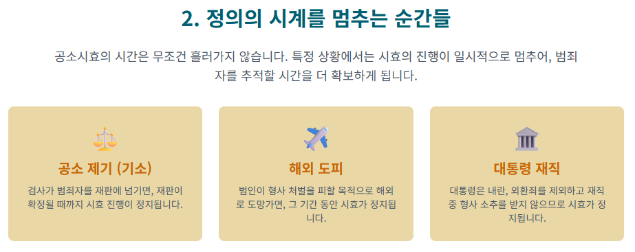자, 이제부터가 핵심입니다. 공소시효가 완성되기 전에 특정 조건이 만족되면, 이 시계는 잠시 멈추거나 아예 사라져 버립니다. 즉, 공소시효가 완성되는 것을 막아 수사와 처벌을 가능하게 하는 법적 장치들이죠.