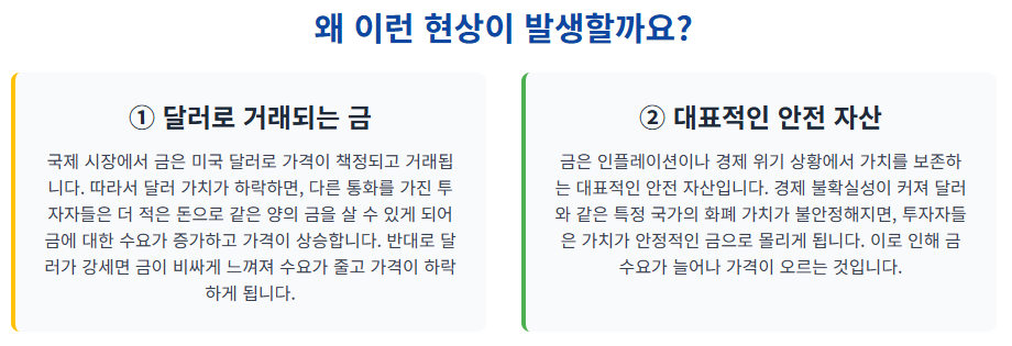 • 가격표가 달러로 붙어있어요: 국제 시장에서 금은 석유나 다른 원자재처럼 미국 달러로만 거래됩니다. 만약 달러의 가치가 올라가면(강달러), 예전보다 더 적은 달러로도 같은 양의 금을 살 수 있게 됩니다. 그러니 자연스럽게 달러로 표시된 금값은 내려가게 되죠. 반대로 달러 가치가 떨어지면(약달러), 금을 사기 위해 더 많은 달러가 필요하니 금값은 올라갑니다.