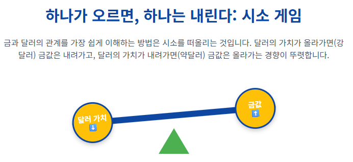 글로벌 경제에서 금과 미국 달러는 마치 시소의 양 끝에 앉아있는 것과 같습니다. 한쪽이 올라가면 다른 한쪽은 내려가는 경향이 뚜렷하죠. 이걸 경제 용어로 '역의 상관관계'라고 부릅니다.