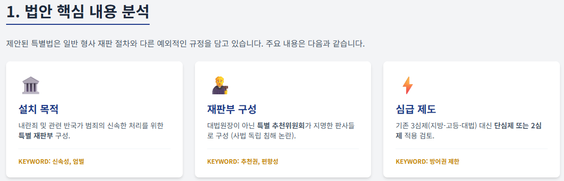 - 전담재판부 설치: 서울중앙지법(1심)과 서울고등법원(2심)에 내란 범죄만을 전담하는 재판부를 의무적으로 만듭니다.