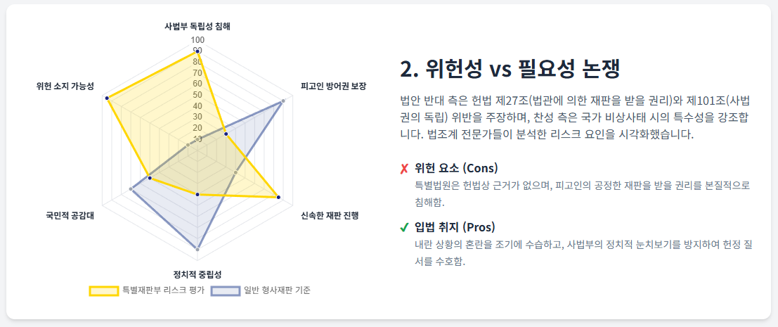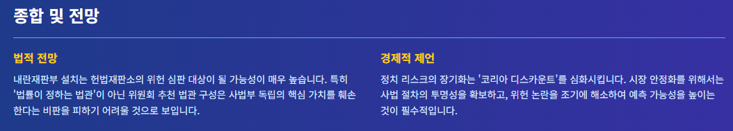 - 사법: 위헌 논란으로 인해 실제 재판은 오히려 장기간 중단될 위험이 있습니다.