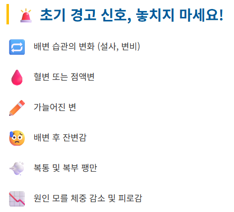 앞서 말했듯, 대장암은 초기에 증상이 거의 없습니다. 증상이 나타났다면 이미 암이 어느 정도 진행되었을 수 있으므로, 아래와 같은 변화에 주의를 기울여야 합니다.
