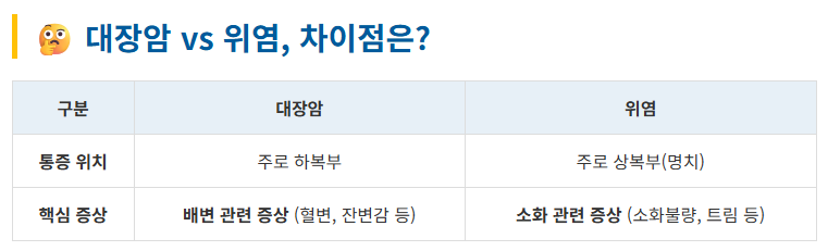 복통이나 소화불량은 매우 흔한 증상이라 대장암 신호를 단순 위염으로 착각하기 쉽습니다. 두 질환의 결정적인 차이는 **'증상의 위치'**와 **'배변과의 관련성'**입니다.