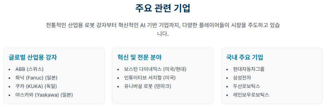 - 관련 기업: 두산로보틱스, 레인보우로보틱스 (AI 내재화 플랫폼), 네이버랩스 (AI/자율주행), 클로봇 (로봇 SW 플랫폼)