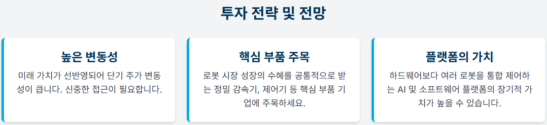 즉, 로봇 섹터 투자는 전통적인 '가치 투자'가 아닌 '성장 투자'의 관점으로 접근해야 합니다. 현재의 적자는 R&D와 시장 점유율 확보를 위한 '필수적 투자'로 해석되고 있으며, 이러한 투자가 미래의 휴머노이드 로봇 대응 및 AI 플랫폼 선점으로 이어질 것이라는 기대감이 시장을 지배하고 있습니다.