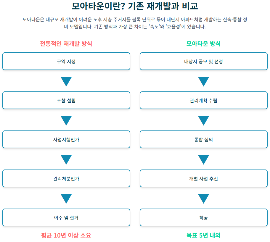 기존의 재개발은 구역 지정부터 완공까지 10년 이상 걸리는 거대한 프로젝트였습니다. 하지만 모아타운은 다릅니다. 대규모로 개발하기 어려운 노후 저층 주거지(빌라, 다세대주택 등)를 여러 개 묶어서(10만㎡ 미만) 하나의 대단지 아파트처럼 개발하는 방식입니다. 개별적으로 진행되던 '가로주택정비사업' 여러 개를 한데 모아 체계적으로 관리한다고 생각하면 쉽습니다.