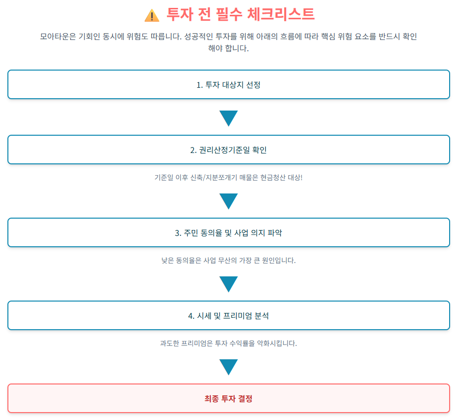 모아타운은 분명 매력적인 기회지만, 그만큼 신중하게 접근해야 합니다. 다음 4가지 사항은 반드시 기억하세요.
