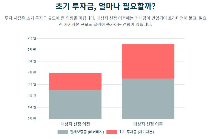 - 초기 투자금: 지역과 물건(신축/구축, 면적 등)에 따라 천차만별입니다. 일반적으로 대상지 발표 전에는 최소 1억 ~ 2억 원대의 갭투자로 진입이 가능한 곳도 있었지만, 대상지로 선정되고 사업에 대한 기대감이 커지면 가격이 급등하여 3억 원 이상의 초기 자금이 필요할 수 있습니다. 이미 사업이 가시화된 곳은 프리미엄이 붙어 훨씬 높은 금액을 요구하기도 합니다.