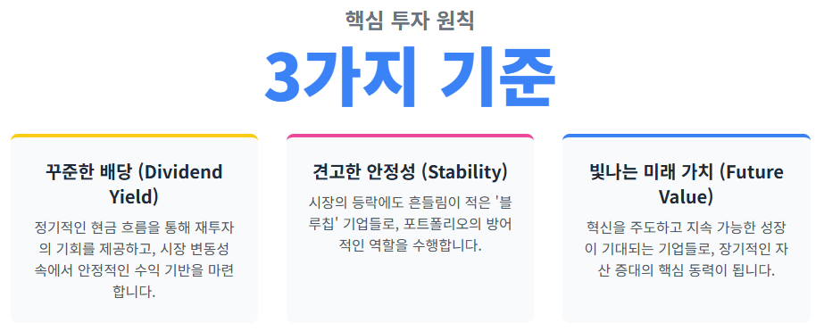 이 글은 단순히 '이 종목이 좋다'고 말하는 목록이 아닙니다. 각 종목이 여러분의 자산 증식 여정에서 어떤 중요한 역할을 하는지, 그리고 이들이 모여 어떻게 강력한 '드림팀'을 만드는지에 대한 이야기입니다. 시장의 단기적인 변동에 흔들리지 않고 꾸준히 부를 쌓아가는 투자, 함께 시작해볼까요?