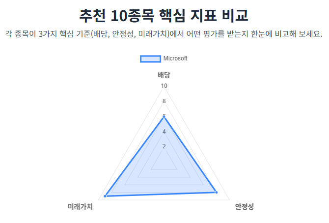 '블루칩'의 대명사인 마이크로소프트는 안정성과 폭발적인 성장성을 동시에 갖춘 보기 드문 기업입니다. 클라우드 서비스 'Azure'는 AI 수요에 힘입어 무섭게 성장하고 있으며 , OpenAI와의 파트너십을 통해 모든 제품에 AI를 심고 있습니다. 배당 수익률은 약 0.6-0.7%로 낮아 보일 수 있지만 , 이는 성장을 위해 막대한 자금을 재투자하고 있다는 증거입니다. 20년 연속 배당금을 늘려왔다는 사실만으로도 그 안정성은 입증됩니다.