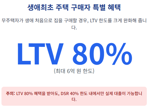 - LTV 70%의 실체: 이는 생애최초 구매자가 '디딤돌 대출'이 아닌, KB국민, 신한 등 일반 시중은행의 주택담보대출을 이용할 때 적용되는 한도입니다. (단, 규제지역 내에서)