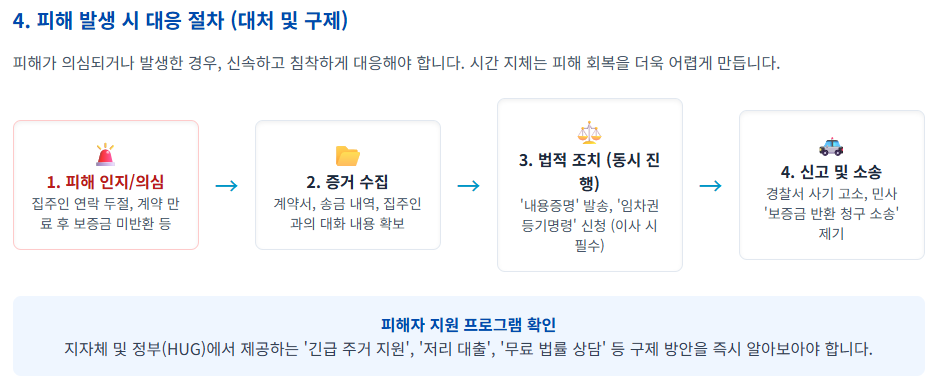 전세 사기 피해가 현실화되었을 때, 신속하고 체계적인 법적 대응은 피해를 최소화하고 권리를 회복하는 데 결정적이다. 다음은 피해 발생 직후부터 법적 절차를 완료하기까지의 단계별 행동 계획이다.