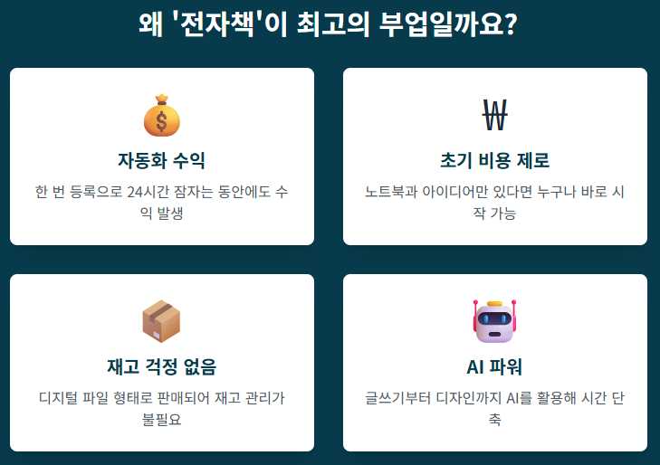 수많은 부업 중에 왜 하필 전자책 출판을 추천할까요? 이유는 명확합니다.