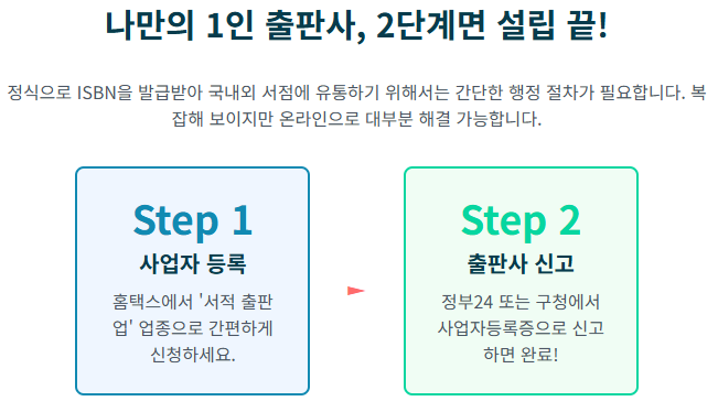 - 사업자 등록: 홈택스를 통해 간단하게 개인 사업자 등록을 신청합니다. 업종은 '서적 출판업'으로 선택하면 됩니다.