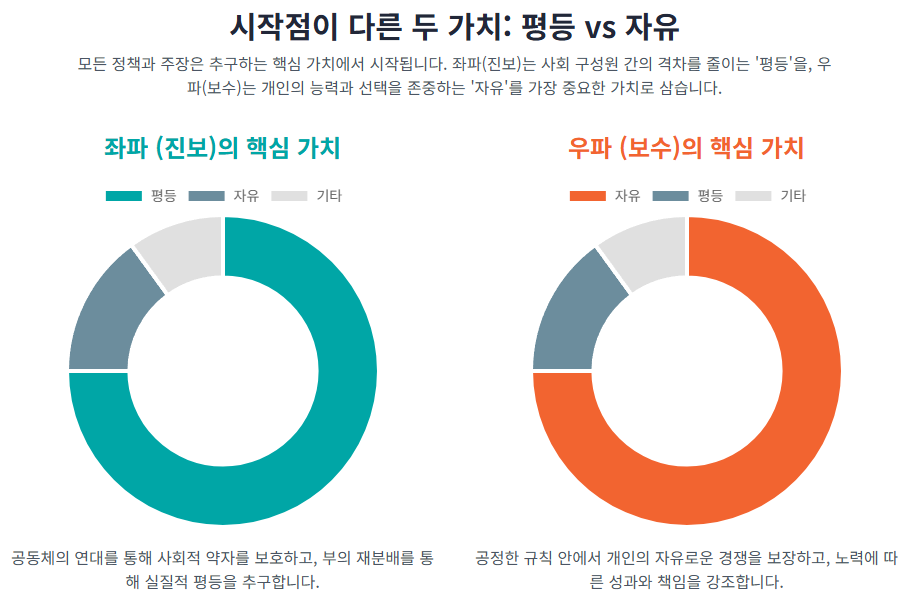 - 진보 (좌파): **'평등'**을 핵심 가치로 삼습니다. 정부가 시장에 적극적으로 개입해서 부를 재분배하고, 복지를 늘려야 한다고 주장하죠. 이걸 '큰 정부'라고 부릅니다. 소득과 상관없이 모두에게 혜택을 주는 **'보편적 복지'**를 선호하는 경향이 있습니다.