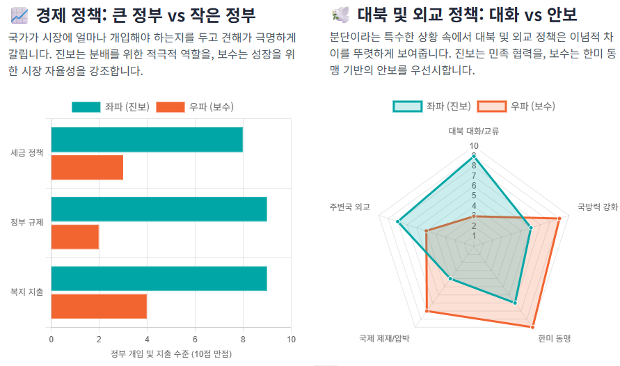 - 보수 (우파): 북한을 신뢰할 수 없는 적대적 **'국가'**로 규정합니다. 강력한 국방력과 굳건한 한미동맹을 통해 북한을 압박하고 억제해야 안보를 지킬 수 있다고 봅니다.