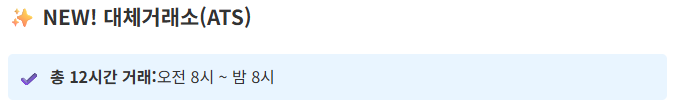 최근 '대체거래소(ATS)'라는 새로운 주식 시장이 문을 열었습니다. 덕분에 이제 오전 8시부터 오후 8시까지, 총 12시간 동안 주식 거래가 가능해졌습니다. 바쁜 직장인들에게는 정말 희소식이죠! 다만, 정규장 외 시간에는 거래량이 적어 가격 변동이 클 수 있으니, 초보 투자자라면 유동성이 가장 풍부한 정규 시간에 먼저 익숙해지는 것을 추천합니다.