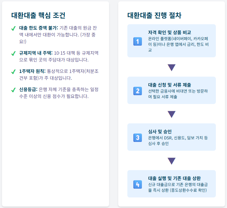 - (비용) **가장 중요한 것은 '중도상환수수료'**입니다. 대환으로 아끼는 이자와 기존 대출의 수수료를 반드시 비교해야 합니다. 그 외에 인지세 등 부대비용도 확인하세요.