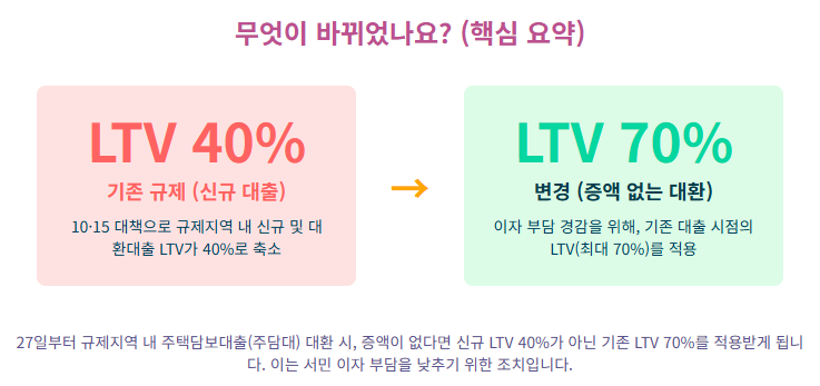 | 규제지역 | 증액 없는 대환대출 | 최초 대출 시점의 LTV 적용 (예: 70%) | 이자 부담 경감 목적의 실수요자 보호 | |