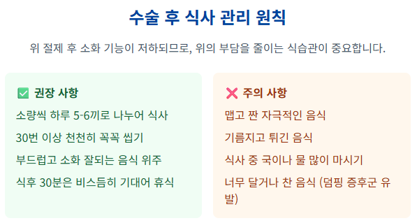 • 덤핑 증후군 예방: 식사 중 국이나 물 섭취를 피하고, 식후 30분 정도는 눕거나 비스듬히 기대어 쉽니다. 너무 달거나 짠 음식은 피합니다.