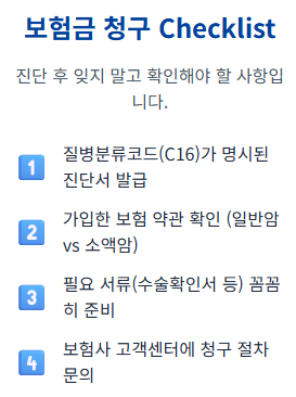 • 진단서 발급: 병원에서 '질병분류코드'가 포함된 진단서를 발급받는 것이 첫걸음입니다. 위암은 보통 'C16' 코드로 표기됩니다.