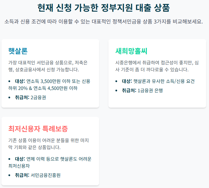 2026년 새로운 정책이 나오기 전까지 손 놓고 기다릴 수만은 없습니다. 현재 저신용 중장년층이 이용할 수 있는 대표적인 정책서민금융 상품은 다음과 같습니다.