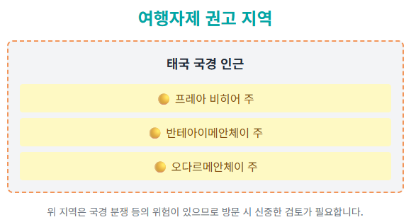 - 영국: 태국 국경 50km 이내 지역은 **"필수 목적 외 여행 자제"**를 권고합니다.