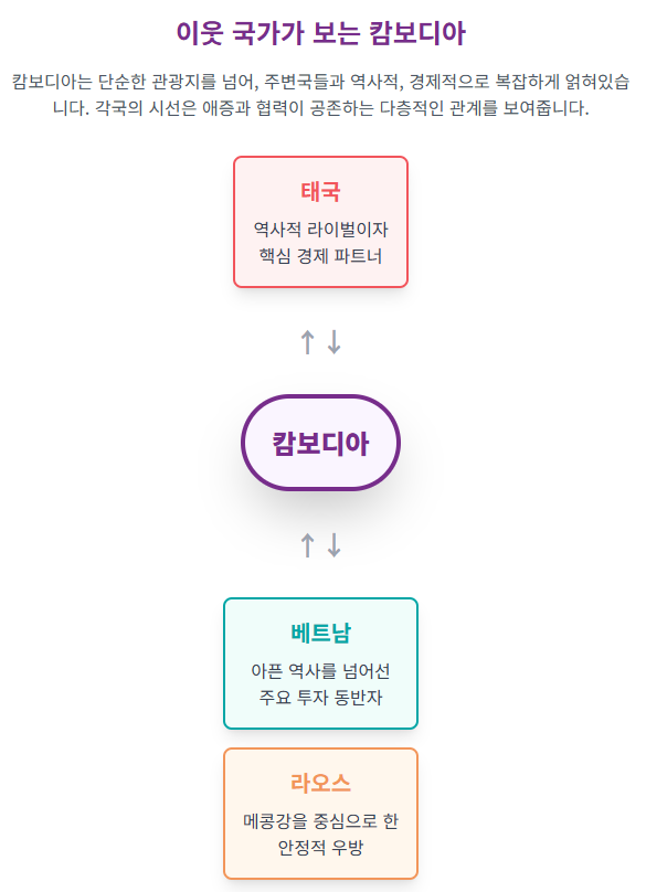 캄보디아의 오늘을 이해하려면, 주변 강대국들과의 아슬아슬한 관계를 먼저 알아야 합니다. 특히 태국, 베트남과의 해묵은 갈등과 중국에 대한 절대적인 의존은 현재 캄보디아의 모든 것을 결정짓는 가장 중요한 열쇠입니다.