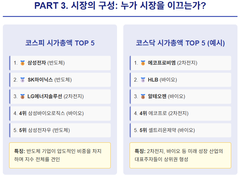 • 코스피: 반도체, 자동차, 금융 등 각 산업을 대표하는 안정적인 대기업(블루칩)들이 중심입니다.