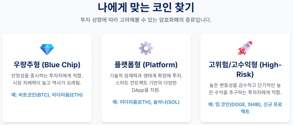 - 안정 추구형 투자자 (강력 추천): 비트코인 (BTC) + 이더리움 (ETH)