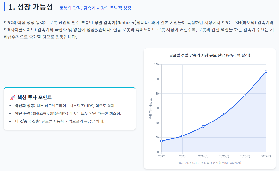 - 피지컬 AI의 최대 수혜: 인공지능이 뇌라면, 로봇의 관절과 근육은 에스피지의 '감속기'와 '액츄에이터'가 담당합니다. 로봇이 사람처럼 섬세하게 움직이려면 고정밀 부품이 필수인데, 에스피지가 이 기술을 꽉 잡고 있습니다.