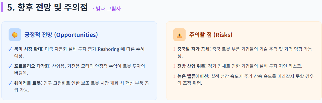 - 기대되는 점: 미중 갈등으로 인한 반사 이익, 베트남 공장 가동을 통한 원가 경쟁력 확보, 그리고 삼성·현대차 등 대기업들의 로봇 사업 본격화에 따른 낙수 효과가 기대됩니다.