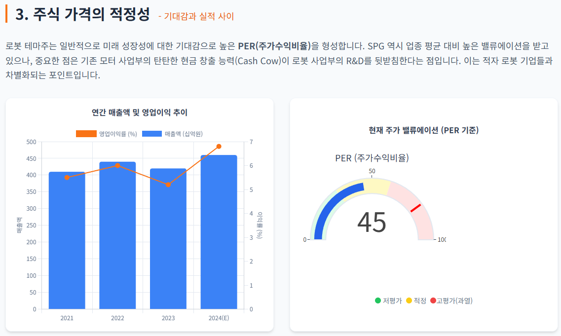 - 이익의 질적 개선: 하지만 재무제표를 뜯어보면 흥미로운 점이 보입니다. 전체 매출은 다소 줄었지만, 영업이익률은 급등했습니다. 돈 안 되는 가전 모터 비중을 줄이고, 마진이 많이 남는 로봇 감속기 비중을 늘렸기 때문입니다. 즉, **"체질 개선"**이 성공적으로 이뤄지고 있다는 뜻입니다. 현재의 높은 주가는 당장의 실적보다는 미래의 폭발적인 성장 기대감이 선반영된 '프리미엄'으로 해석해야 합니다.