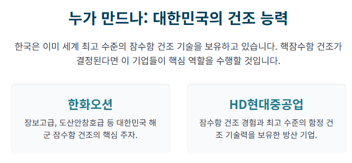 - 현실: 필리조선소는 현재 상선 위주로 건조하며, 핵잠수함 건조에 필요한 설비가 **전무(0)**합니다.