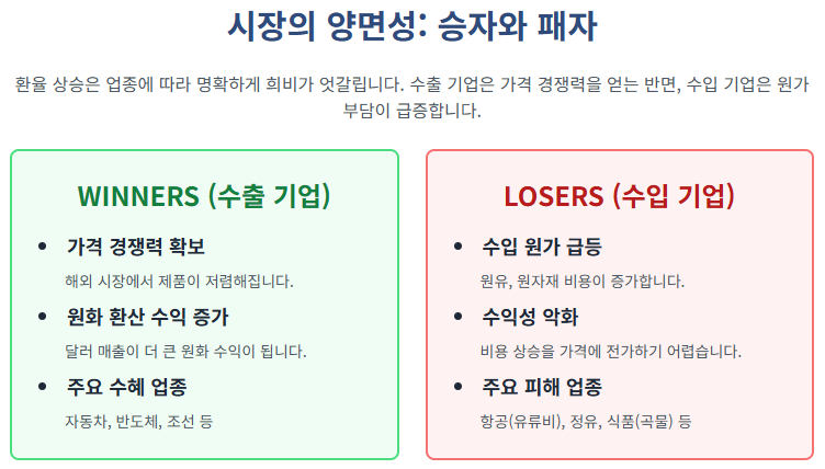 고환율은 우리 경제의 모습을 완전히 바꾸어 놓습니다. 누군가에게는 절호의 기회가, 다른 누군가에게는 혹독한 시련이 될 수 있죠.