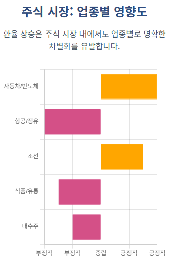 • 수입·내수 기업 (항공, 에너지, 식음료): 반면 수입에 의존하는 기업들은 직격탄을 맞습니다. 항공사는 비행기 리스 비용과 항공유를 달러로 결제하기 때문에 비용 부담이 눈덩이처럼 불어납니다. 원자재를 수입해 물건을 만드는 철강, 식음료 기업들도 원가 압박에 시달리게 되죠.
