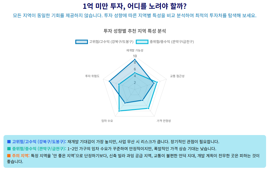 ⚠️ 재개발 이슈는 '함정'일 수 있습니다. '모아타운' 이나 재개발 가능성을 보고 낡은 빌라에 투자하는 것은 매우 위험한 전략입니다. 1억 미만 예산으로 접근 가능한 곳은 사업이 확정되지 않은, 소문만 무성한 곳일 확률이 높습니다. 수십 년이 걸리거나 아예 무산될 수 있으니, 실거주 목적의 첫 주택 구매자에게는 적합하지 않습니다.