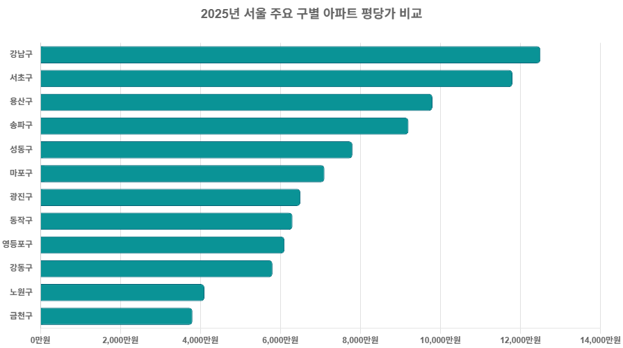 - 🏆 상위 그룹 (대장주): 강남 3구의 막내 **송파구(6,098만 원)**가 뒤를 잇고 14, 용산국제업무지구로 들썩이는 용산구, 신흥 부촌 성동구가 이 그룹을 형성합니다.