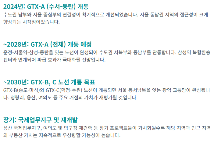 - 🚄 GTX-A (파주 운정~화성 동탄): 이미 현실이 된 미래! 2024년 남부 구간이 개통했고, 연말이면 북부 구간(운정~서울역)도 열립니다.16 서울 내 최고 수혜지는 **연신내(은평구), 서울역(중구), 삼성/수서(강남구)**입니다. 특히 연신내는 강남 접근성이 획기적으로 개선되며 서북권의 위상을 바꿔놓을 것입니다.