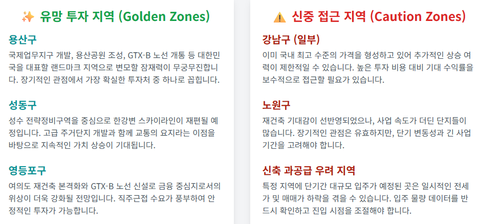 | 용산구 | - | 용산국제업무지구, 용산공원, GTX-B | 중립 / 최상 | 개발 장기화 가능성, 높은 진입 장벽 |