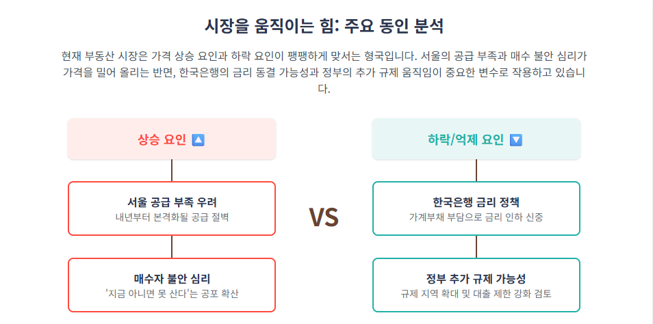 현재 부동산 시장은 가격 상승 요인과 하락 요인이 팽팽하게 맞서는 형국입니다. 서울의 공급 부족과 매수 불안 심리가 가격을 밀어 올리는 반면, 한국은행의 금리 동결 가능성과 정부의 추가 규제 움직임이 중요한 변수로 작용하고 있습니다.