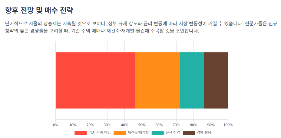 단기적으로 서울의 상승세는 지속될 것으로 보이나, 정부 규제 강도와 금리 변동에 따라 시장 변동성이 커질 수 있습니다. 전문가들은 신규 청약의 높은 경쟁률을 고려할 때, 기존 주택 매매나 재건축·재개발 물건에 주목할 것을 조언합니다.