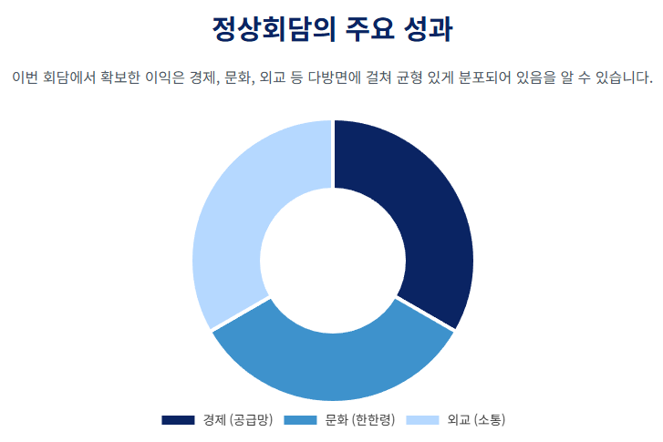| 경제 | - 미국 자동차 관세 10%p 인하 - 한중 공급망 안정화 및 FTA 협상 진전 - APEC 개최에 따른 약 7.4조 원의 경제 효과 |