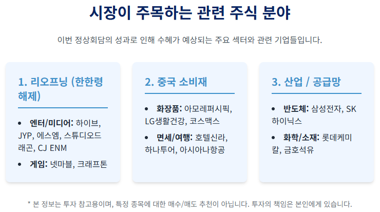 | 엔터/화장품/관광 | '한한령' 해제 (기대) | 하이브, 아모레퍼시픽, 호텔신라 등 | 고위험·고수익 투자. 정책 변화에 따라 주가 변동성 크지만, 해제 시 성장 잠재력 폭발적. |