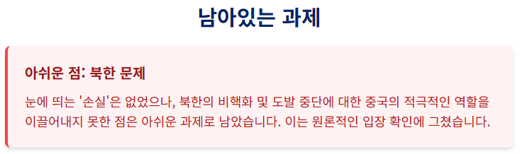 | 안보 | - 한미 동맹의 굳건함 재확인 | - 북한 비핵화 문제의 실질적 진전 부재 - 핵추진잠수함 등 민감 이슈로 인한 역내 긴장 고조 가능성 |
