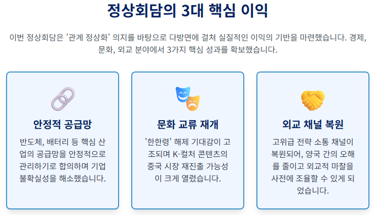 - 한중 정상회담의 의미: 악화일로를 걷던 양국 관계에 제동을 걸고, 경제 협력의 물꼬를 다시 텄습니다. 이는 사드(THAAD) 사태 이후 한국 경제를 짓눌러 온 불확실성을 상당 부분 해소하는 계기가 되었습니다.