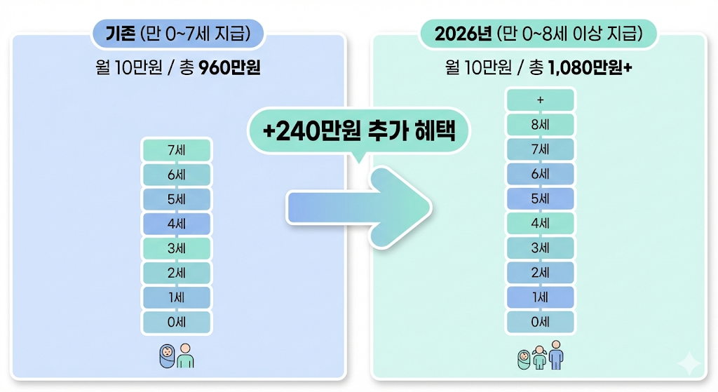 | 2026년 확대 | 만 0~8세 이상 | 9년 이상 | 1,080만원 이상 |