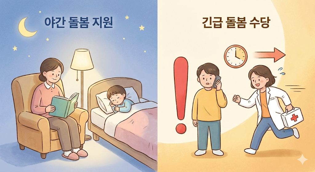 - 야간 돌봄 수당: 평일 야간 근무, 교대근무 등으로 저녁/밤 시간 돌봄이 필요한 가정 지원