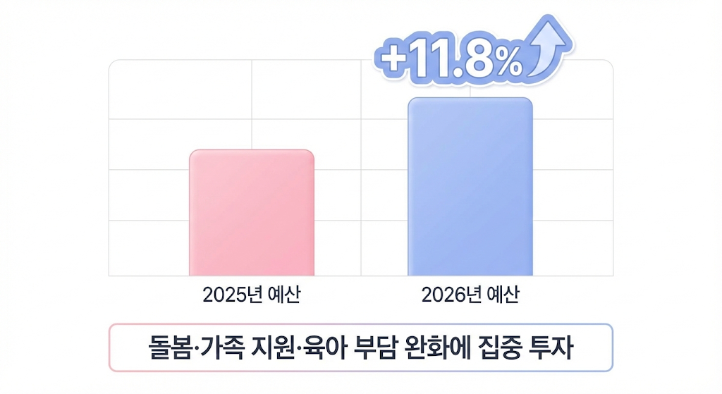 2026년 여성가족부의 육아 및 가족 지원 관련 예산이 전년 대비 11.8% 증가하여 더 많은 가정이 실질적인 혜택을 받을 수 있게 되었습니다.