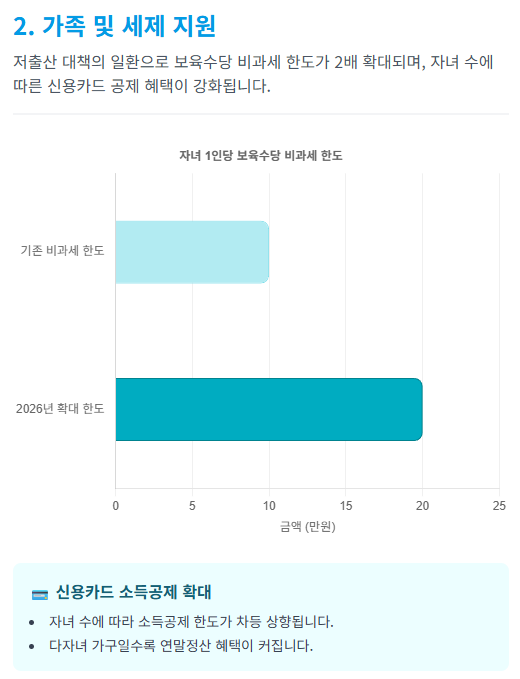 - 신용카드 소득공제: 자녀 수에 따라 공제 한도가 늘어납니다. 자녀가 2명 이상이면 기본 한도보다 100만 원을 더 공제받을 수 있습니다.